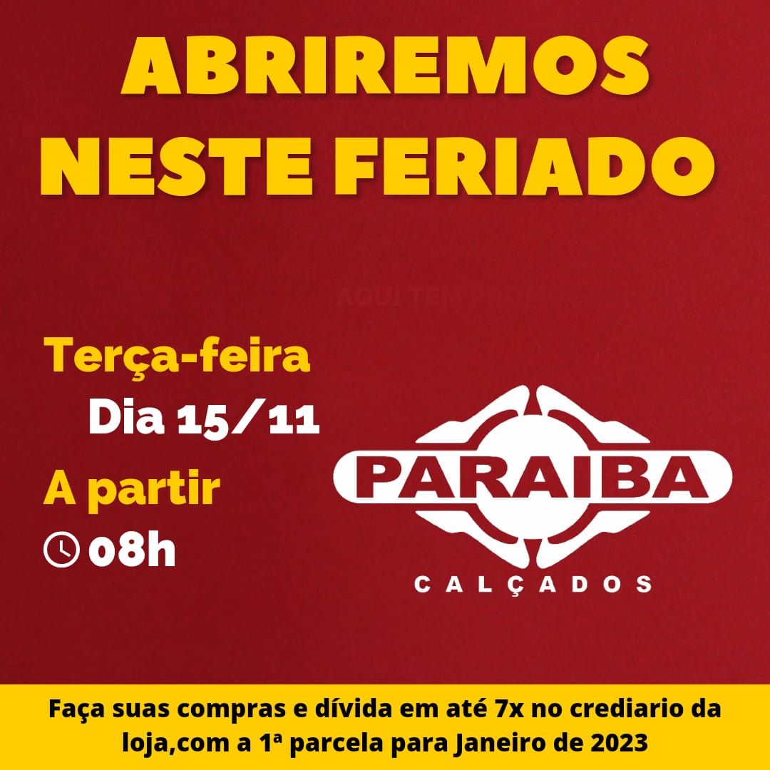 A Paraíba Calçados, na Rua Pedro Firmino, no centro de Patos, já está em clima de Black Friday com excelentes preços em vários dos seus produtos e informa que abrirá das 8h às 14h desta terça-feira, 15/11, feriado da Proclamação da República. Temos calçados (masculinos, femininos e infantis), cintos, bolsas, carteiras e muito mais para você. Venha conferir!