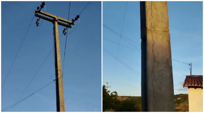 Um poste de alta tensão com rachaduras na estrutura está ameaçando cair na Emanuel Gomes do Nascimento, no Alto do Desterro, em Vista Serrana, na Região Metropolitana de Patos.