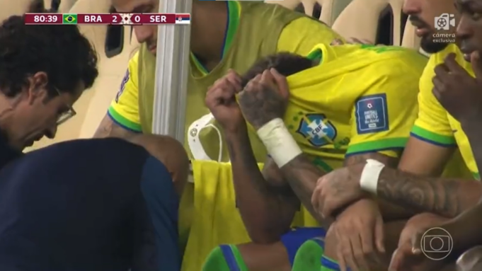 Neymar foi substituído no segundo tempo da vitória por 2 a 0 do Brasil sobre a Sérvia, na estreia da Copa do Mundo do Qatar, por causa de dores no tornozelo direito. O camisa 10 da seleção deixou o gramado chorando de dor e fez gelo no local ainda no banco de reservas. Ao fim da partida, a transmissão mostrou Neymar descalço, mancando, a caminho do vestiário.