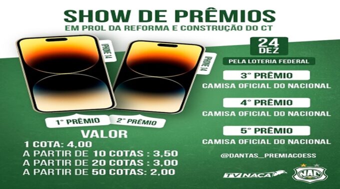 Ao todo, serão cinco sorteios pela Loteria Federal. No primeiro e segundo prêmios, um iPhone 14 estimado em R$ 8 mil. Do terceiro ao quarto prêmios, camisa oficial da temporada do clube. A diretoria do Naça informou que quem for sorteado com um dos aparelhos celulares pode optar por levar o valor do prêmio em dinheiro.