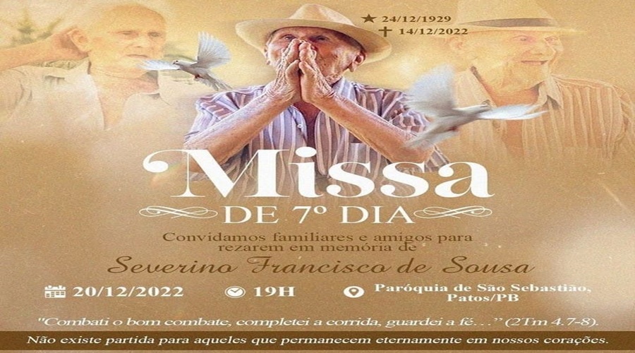 A família do senhor Severino Francisco de Sousa convida parentes e amigos para a Missa de 7º Dia em sufrágio de sua alma.