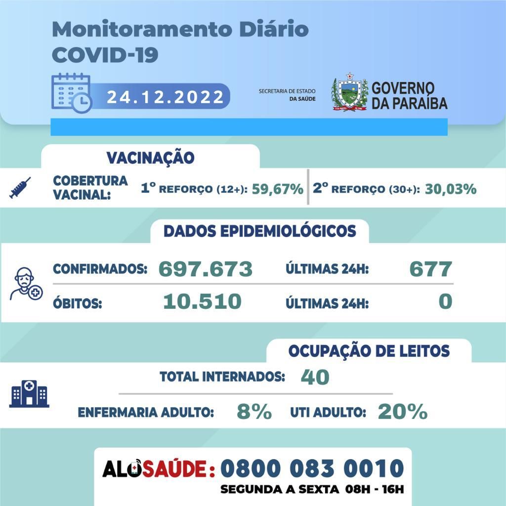A Secretaria de Estado da Saúde (SES) registrou, neste sábado (24), 677 casos de Covid-19. Entre os casos confirmados, 10 (1,48%) são moderados ou graves e 667 (98,52%) são leves. Agora, a Paraíba totaliza 696.996 casos confirmados da doença, que estão distribuídos por todos os 223 municípios.