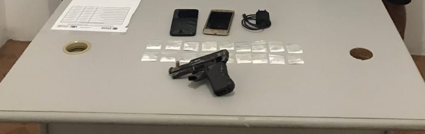 Ao realizarem abordagem nos dois homens foram encontrados, com os mesmos, uma arma de fogo cal 380 e 18 sacos com substância análoga a cocaína.