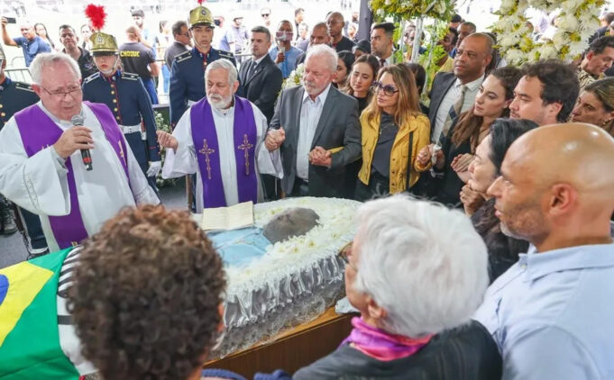 O presidente Luiz Inácio Lula da Silva (PT) esteve em Santos, no litoral de São Paulo, para o velório de Edson Arantes do Nascimento, o Pelé. Ele estava acompanhando da primeira dama, Janja Lula da Silva. A agenda foi a primeira de Lula como presidente fora de Brasília.
