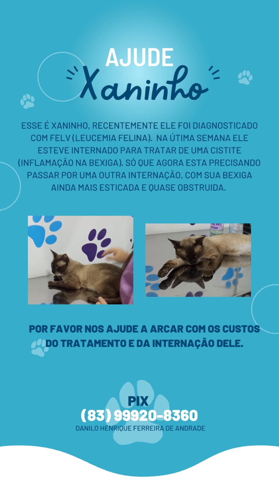 O jovem estudante Danilo Henrique, que mora no Bivar Olinto, em Patos, está fazendo uma campanha online para ajudar no tratamento do seu gato de estimação chamado Xaninho.