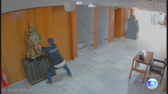 As cenas registradas mostram a destruição promovida pelos extremistas bolsonaristas (veja todas no vídeo). Às 15h26, a primeira cena: um dos invasores atira um extintor contra uma das vidraças do andar térreo do palácio. Gases escapam do extintor e o homem, então, arremessa mais um, quebrando o vidro.