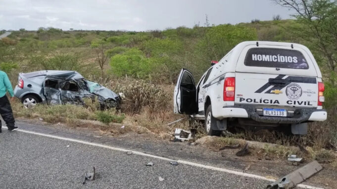 Um policial civil e uma mulher ficaram feridos em um acidente envolvendo uma viatura e um automóvel, na tarde desta quarta-feira (18), em Damião, no Curimataú paraibano.