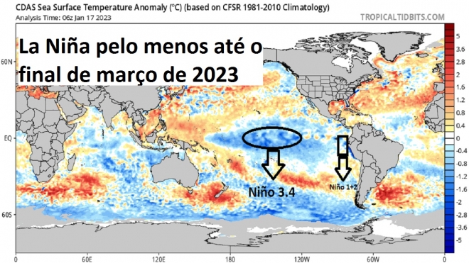 De acordo com as observações dos dados de temperatura da superfície dos oceanos de 17 de janeiro de 2023, na região do Niño 3.4, que é a de maior correlação com a distribuição dos ventos em altitude sobre várias regiões do mundo, o desvio de temperatura é de aproximadamente -0,97ºC, isso significa que o fenômeno continua configurado, e deverá persisitir em atividade nos próximos meses.