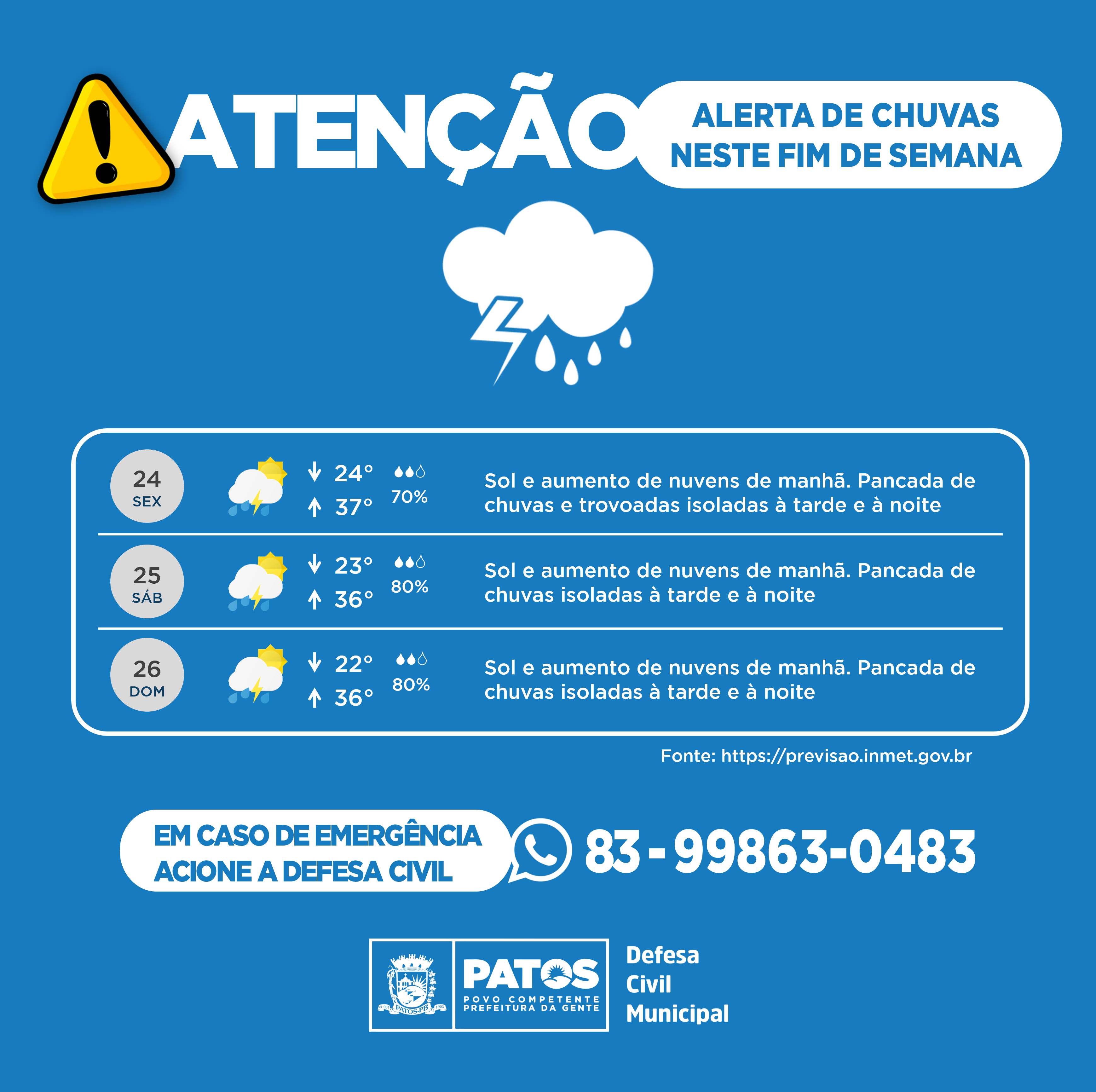 O coordenador da Defesa Civil do Município, Josimar Barbosa, traz alerta repassado pelo Instituto Nacional de Meteorologia – INMET, tratando de novas chuvas para este fim de semana, principalmente no período da tarde, podendo se estender durante a noite.