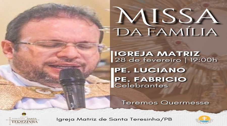 A partir das 19h desta terça-feira, 28/02, o padre Fabrício Dias Timóteo, pároco da Paróquia Nossa Senhora da Conceição, em Taperoá, no Cariri paraibano, celebrará ao lado do padre Luciano, vigário da Paróquia de Santa Terezinha, a Missa da Família em Santa Terezinha, na Região Metropolitana de Patos.