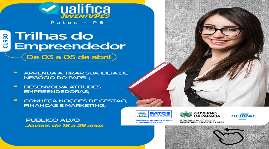 A edição 2023 do Qualifica Juventudes, da Secretaria de Estado da Juventude, realiza nos dias 03, 04 e 05 de abril, em parceria com a Prefeitura de Patos, através da Secretaria Executiva de Políticas Para a Juventude e Lazer e Secretaria Municipal de Desenvolvimento Econômico e Habitação, o curso: Trilhas do Empreendedor Criativo, ministrado pelo Sebrae.