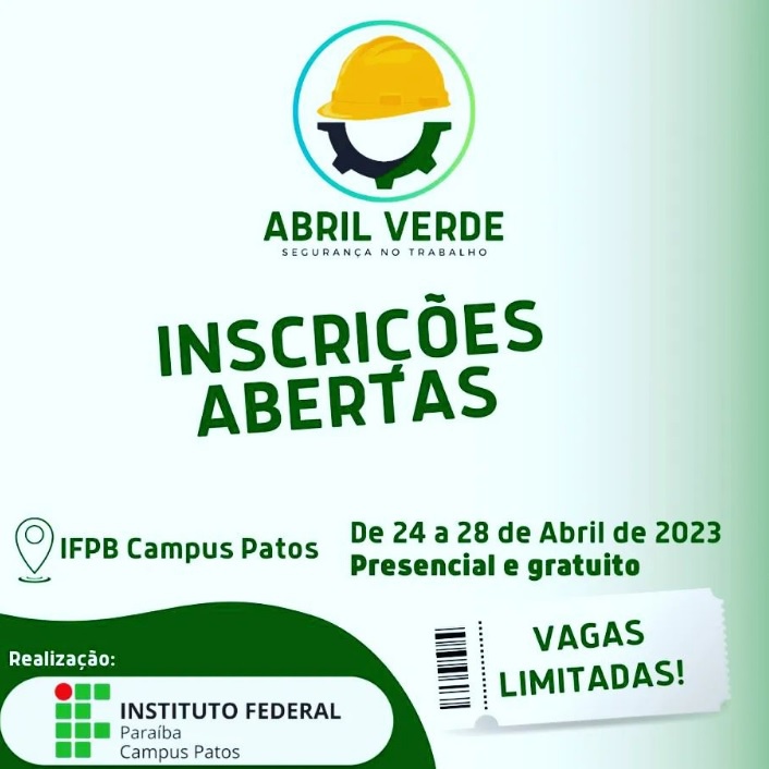 O Instituto Federal da Paraíba (IFPB) Campus Patos realizará entre os dias 24 e 28 de abril, o evento “Abril Verde: Juntos Pela Segurança Nos Ambientes de Trabalho”, que tem como objetivo conscientizar e sensibilizar a população sobre a importância da segurança do trabalho em seu ambiente laboral.