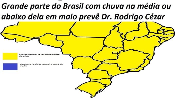 A previsão elaborada pelo físico, meteorologista, mestre em Meteorologia e doutor em Física Quântica Rodrigo Cézar, é de chuvas variando de normais a abaixo da média em maio em grande parte do Brasil, que inclui o centro-sul, Região Nordeste, Centro-Oeste e grande parte da Região Norte, apenas o extremo norte da Região Norte do país poderá ter chuvas variando de normais a acima da média em maio.