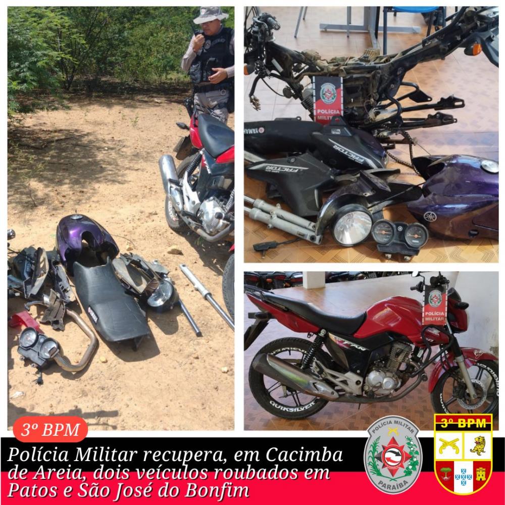 Ao chegar à área indicada, no sítio Urtiga em Cacimba de Areia, os policiais encontraram duas motocicletas e, ao consultarem os dados, verificou-se que uma havia sido roubada em São José do Bonfim nesta última quarta-feira e a outra foi roubada no último domingo em Patos. Uma das motos estava em elevado processo de desmanche.