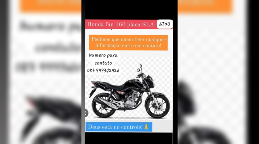 Qualquer informação que possa levar ao paradeiro da motocicleta entrar em contato pelo número (83) 99934-2926.
