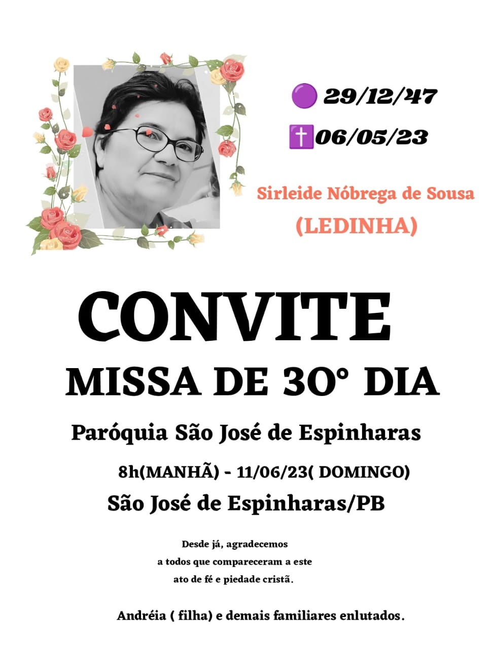 Os familiares da senhora Sirleide Nóbrega de Sousa (Ledinha) convidam parentes e amigos para a Missa de 30° Dia em sufrágio de sua alma.
