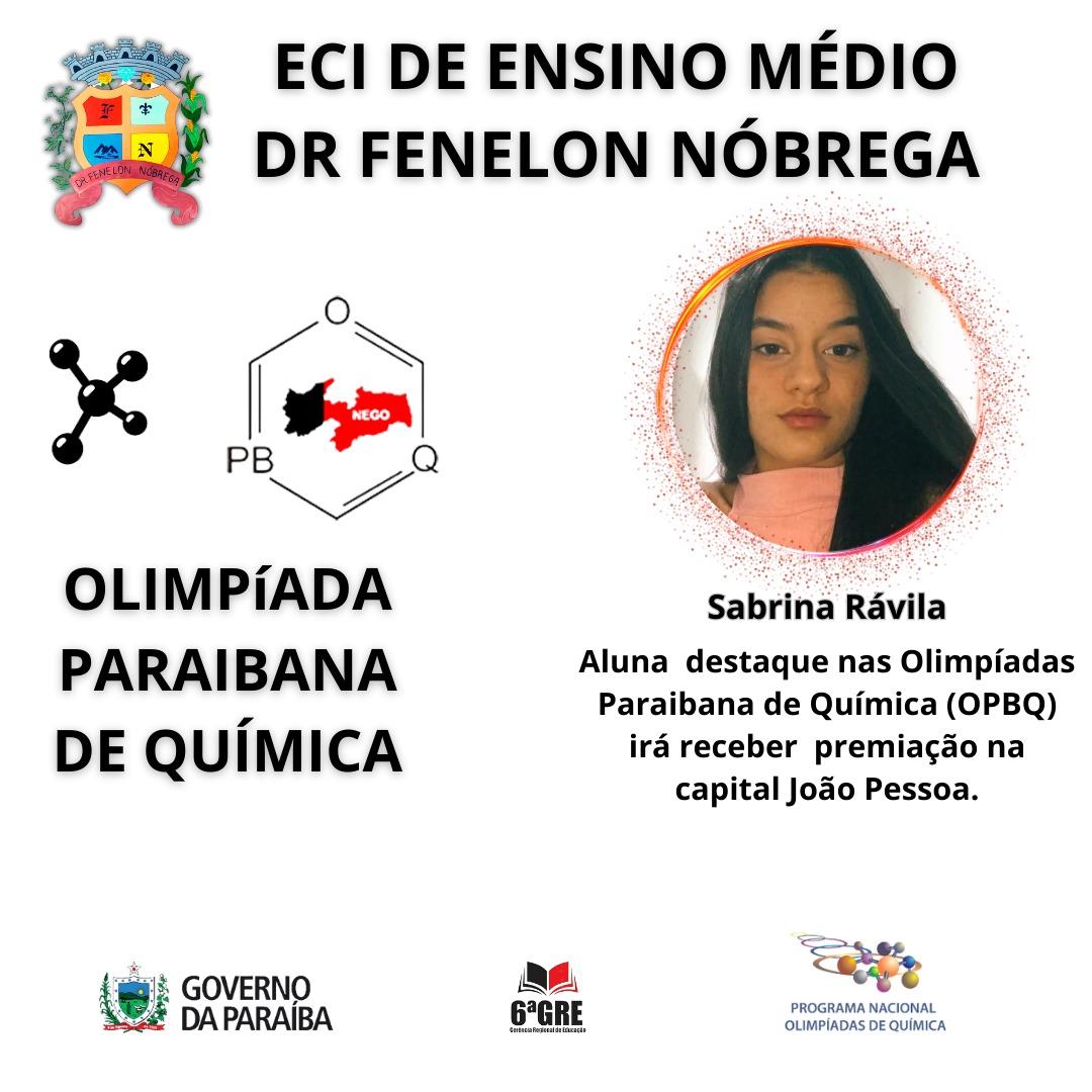 A jovem Sabrina Rávila Santos Queiroz, estudante do 2ª ano do ensino médio da ECI Dr. Fenelon Nóbrega, em Salgadinho, pertencente a 6ª Região de Ensino, sediada em Patos, foi destaque na Olimpíada Paraibana de Química (OPBQ) e receberá uma premiação em João Pessoa nesta terça-feira, 20/06. Todos da escola estão muito contentes com mais uma conquista de um(a) aluno(a).