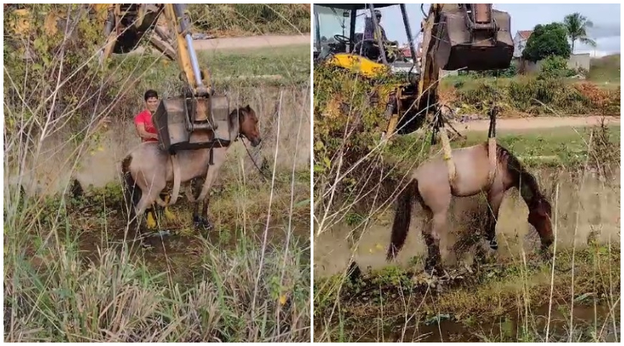 O Corpo de Bombeiros resgatou um cavalo que caiu no Canal do Frango, comunidade do bairro Dom Bosco, em Patos.