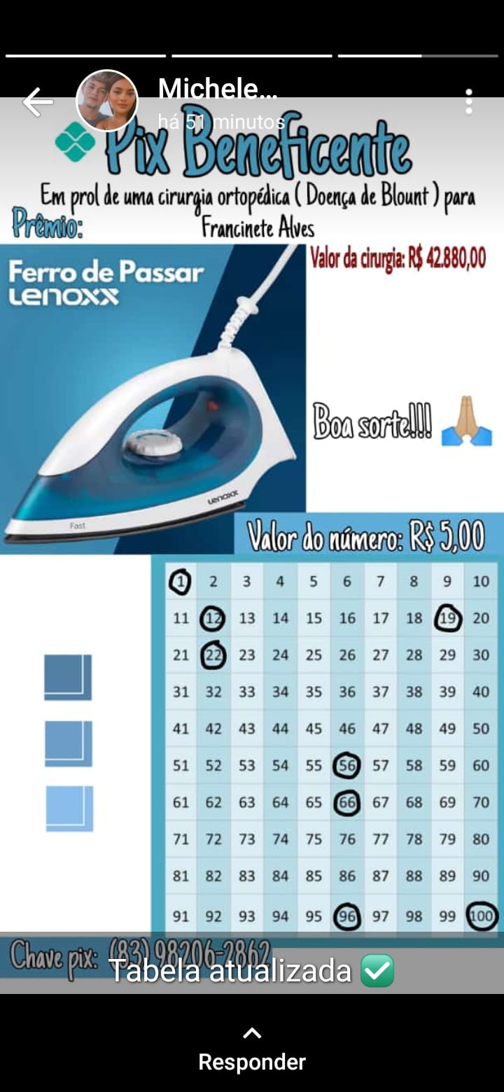 Quem puder e quiser ajudar, pode transferir qualquer valor para o PIX celular (83) 98206-2862. Pode ainda falar com Francinete ou com sua família e colaborar de alguma outa forma, caso seja possível.