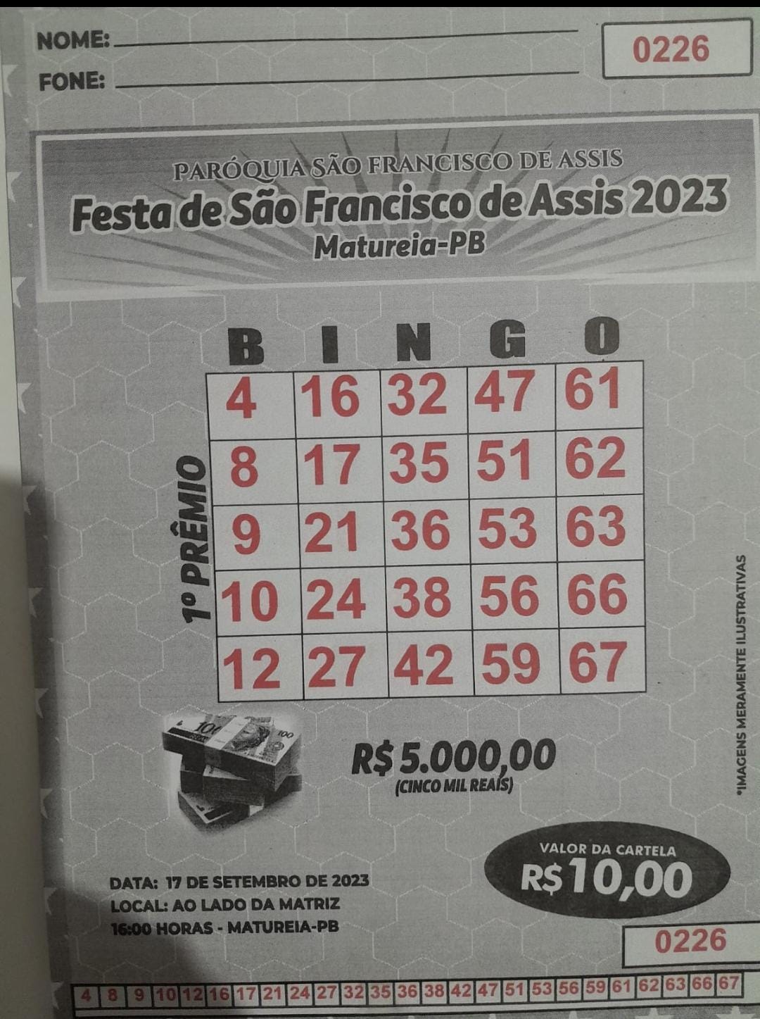 Para adquirir as cartelas do bingo ou obter mais informações os interessados podem entrar em contato através do número (83) 99673-7361.