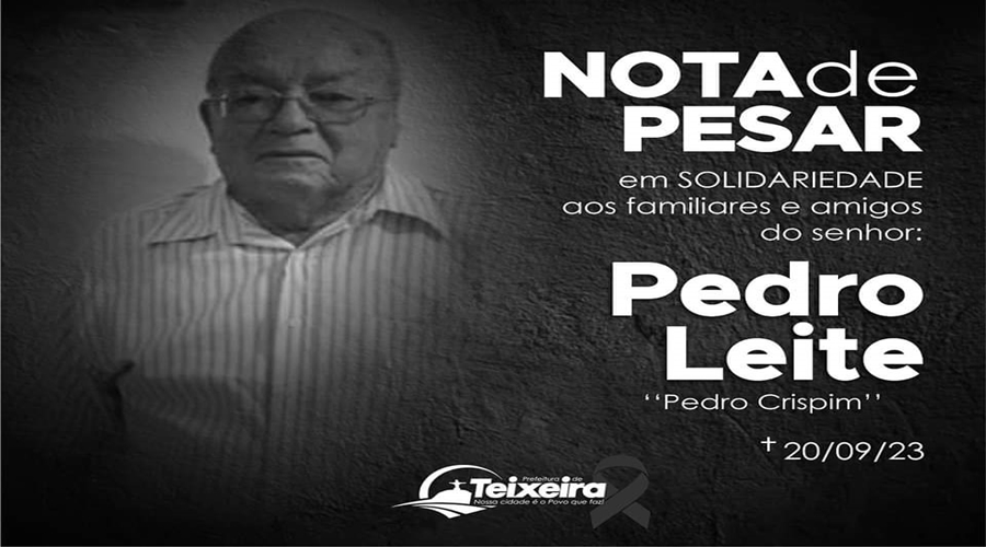 A Prefeitura Municipal de Teixeira-PB, por meio da presente NOTA, vem a público manifestar profundo pesar e condolências aos familiares e amigos do senhor, Pedro Leite e Lima, pelo seu falecimento ocorrido nesta quarta-feira, 20 de setembro de 2023.
