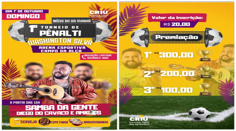 Esta você não vai perder. Neste domingo, 24 de setembro, acontecerá o 1º Torneio de Pênalti da Arena Esportiva Campo da Alça, a partir das 8h, em homenagem ao professor Washington Silva (in memoriam).