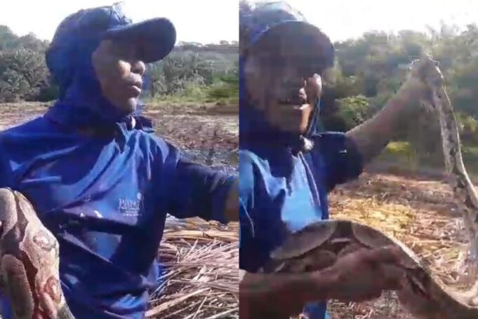 “Aí pessoal, olha. Olha o tamanho da bicha. Maior do que eu. Olha a grossura. Aqui é Japungu, a gente faz isso, para não tá machucando. Isso é coelho é tudo que a gente pega. Isso é a segunda cobra que eu vou pegando e eu não deixo o pessoal matar não. A natureza”, diz o trabalhador em trecho do vídeo.