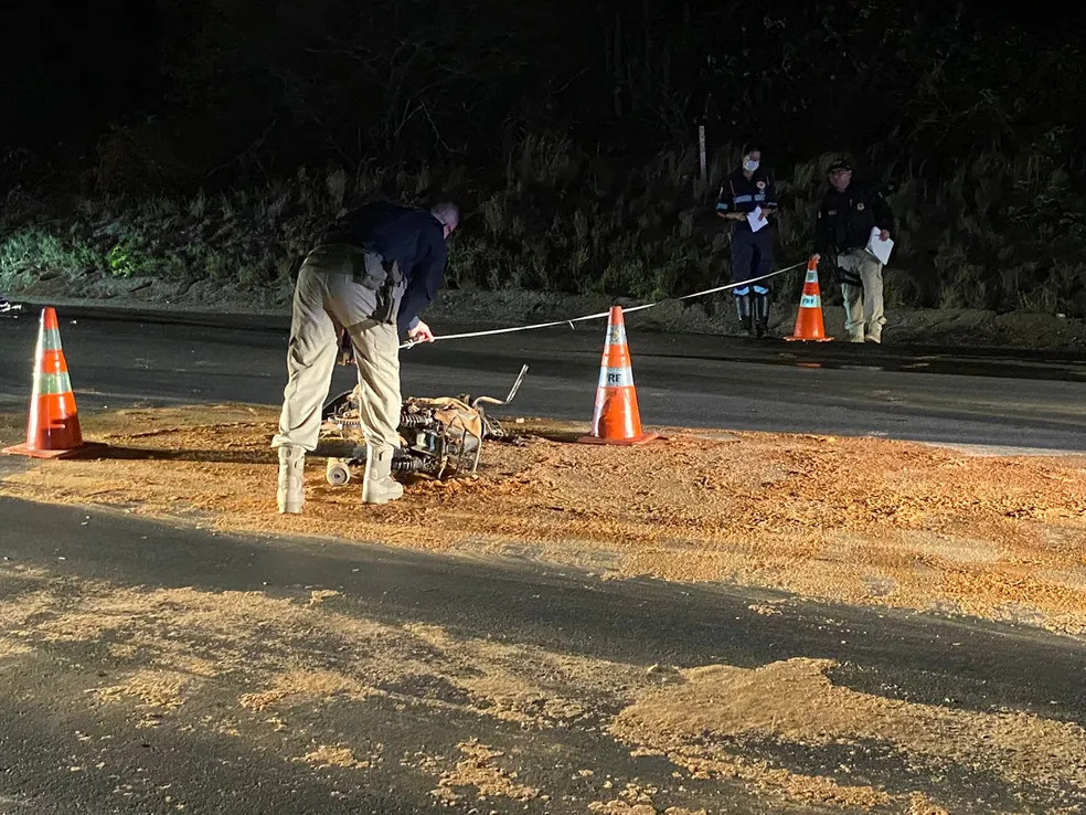 Na colisão, uma das vítimas foi arremessada para a margem da pista, o capacete saiu com o impacto. Já o outro homem, ficou no local do acidente, com o capacete ainda na cabeça.