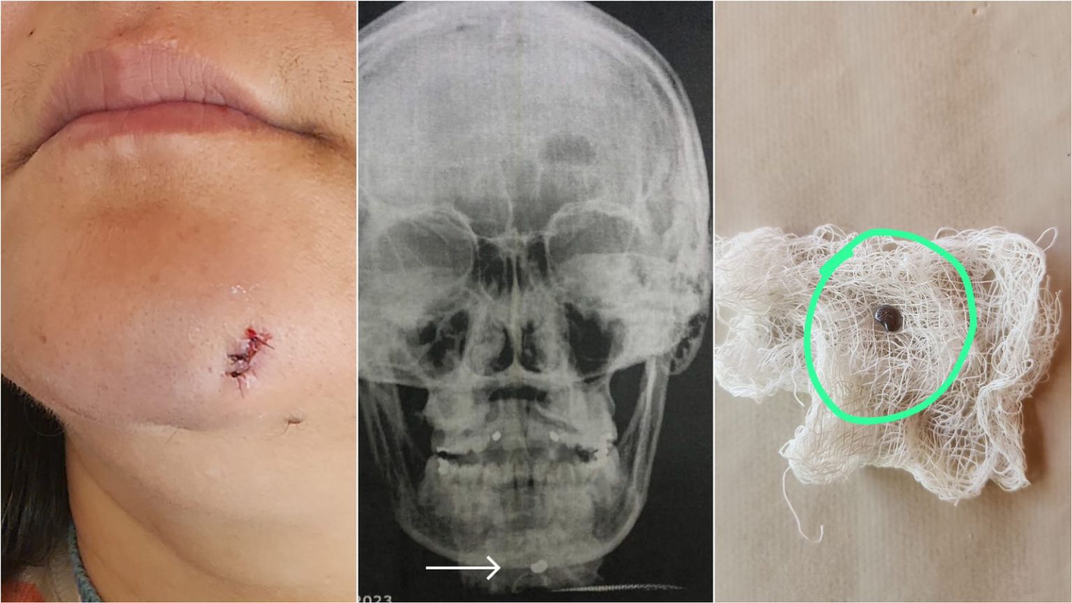 De repente, a mesma sentiu um forte impacto no rosto, mais precisamente no queixo. Ao verificar melhor, ela percebeu que tinha sido atingida por uma bala de chumbinho, proveniente de uma barraca que estava na frente da lanchonete.