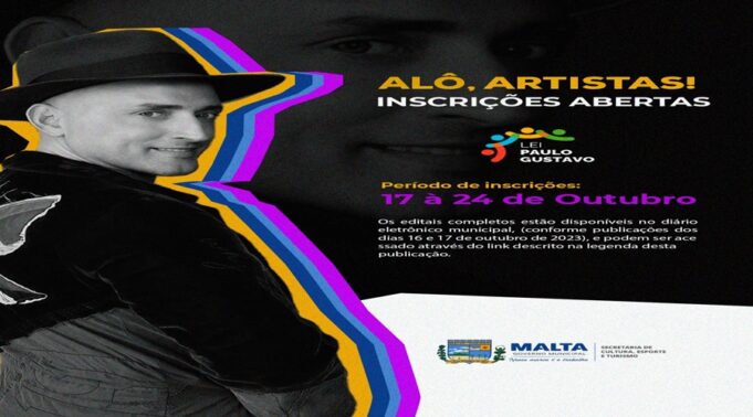 A Prefeitura Municipal de Malta, na Região Metropolitana de Patos, por meio da Secretaria Municipal de Cultura, Esporte e Turismo, anunciou na última segunda-feira (16) a abertura dos editais da Lei Paulo Gustavo, com o objetivo de fortalecer o cenário cultural e artístico do município. Os editais visam premiar agentes culturais, além de impulsionar projetos audiovisuais e demais áreas da cultura. O período de inscrição é de 17 à 24 de outubro de 2023.