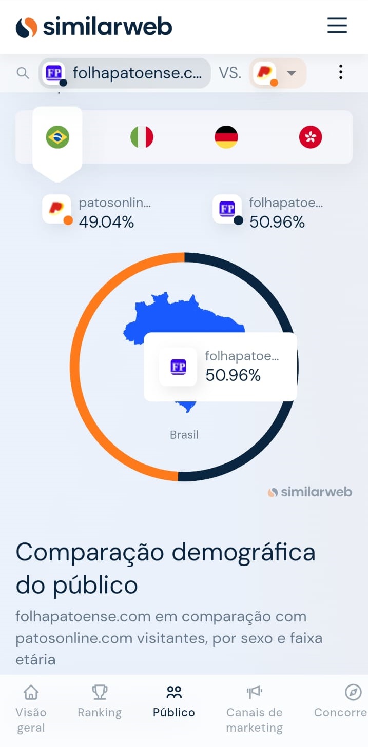 Há muitos meses o quadro está assim. O patosonline tem mais acessos no mundo todo e a Folha Patoense tem mais acessos no Brasil.