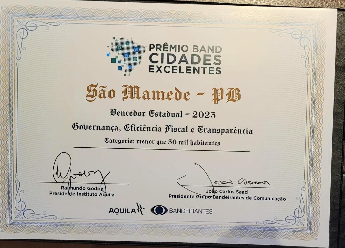 A cidade de São Mamede, na Região Metropolitana de Patos, foi agraciada pela 3ª vez seguida com o Prêmio Cidades Excelentes durante uma cerimônia realizada nesta terça-feira, 28 de novembro, em João Pessoa. O evento, promovido pela Band PB, reconheceu o comprometimento e a excelência do município e da administração do prefeito Umberto Jefferson e do prefeito interino Chaguinha Lopes e sua equipe na gestão municipal.