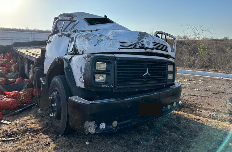 Um caminhão carregado com cebolas que seguia da cidade de Baraúna, no Rio Grande do Norte, com destino ao município de Patos, capotou no início da manhã desta quarta-feira (29) no triângulo que dá acesso ao município de Catolé do Rocha, na BR-230, em Pombal.