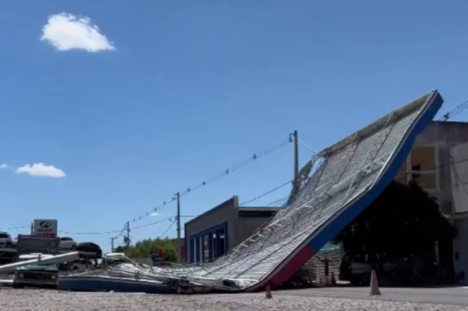 O material ficou por cima da fiação elétrica e chegou a bater em um veículo estacionado. Testemunhas que presenciaram a cena detalharam haver outros problemas na cidade durante o dia, como falta de sinal de telefone e energia.
