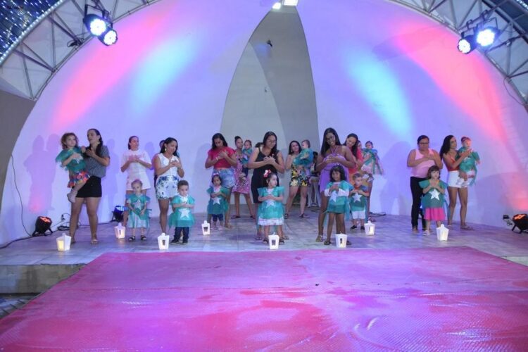 A facilitadora Tia Aline abriu a noite com uma emocionante apresentação da Primeira Infância, tema da decoração natalina deste ano, destacando mamães e seus bebês, proporcionando um momento adorável e único para crianças de 0 a 6 anos.