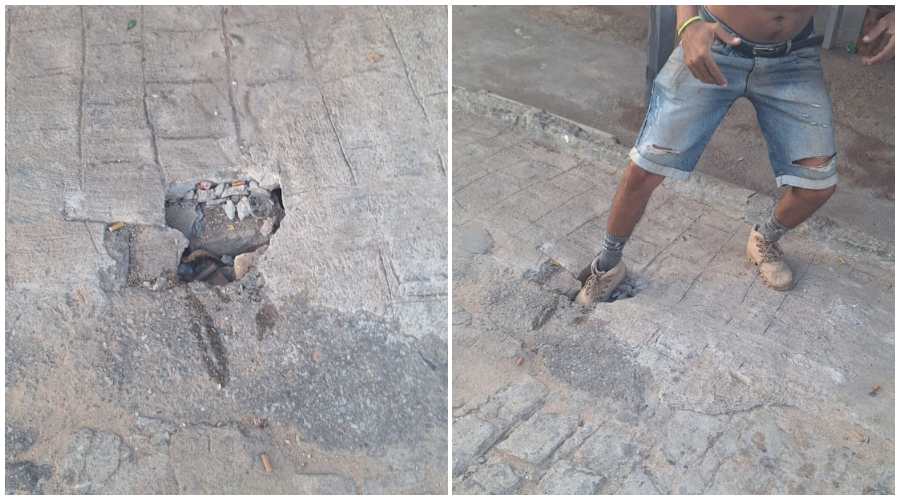 Segundo os residentes, o buraco está cedendo e aumentando de tamanho aos poucos. “Isso traz perigo para quem trafega por aqui, principalmente crianças, idosos e pessoas com deficiência. Até mal cheiro está exalando”, disse um dos moradores.
