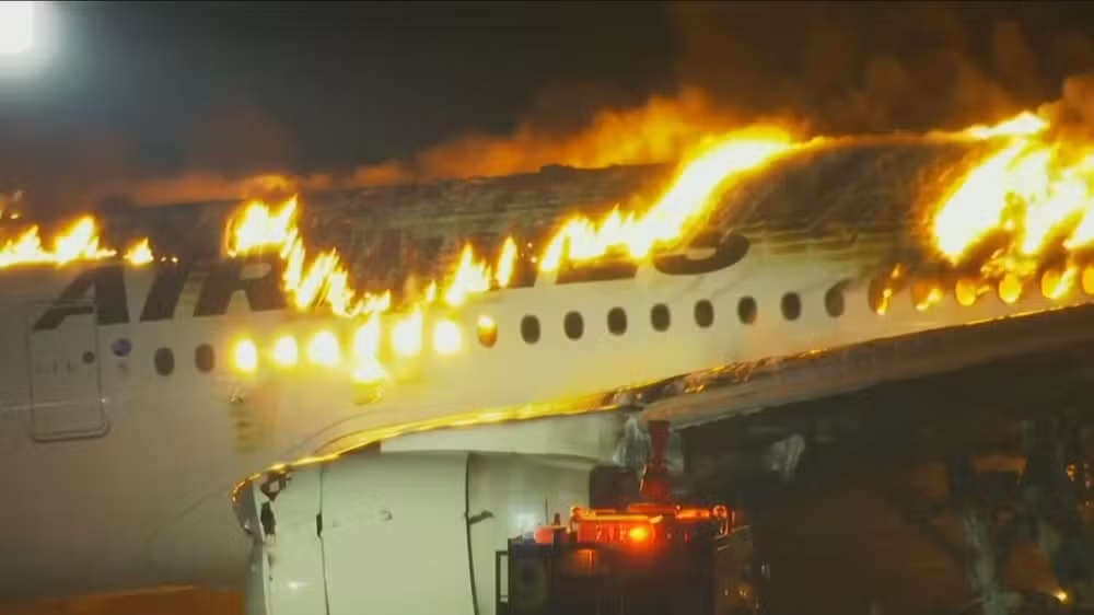 Um avião da Japan Airlines com 367 passageiros e 12 tripulantes pegou fogo após bater em uma aeronave da Guarda Costeira do Japão na pista do aeroporto internacional de Haneda, em Tóquio, nesta terça-feira (2).