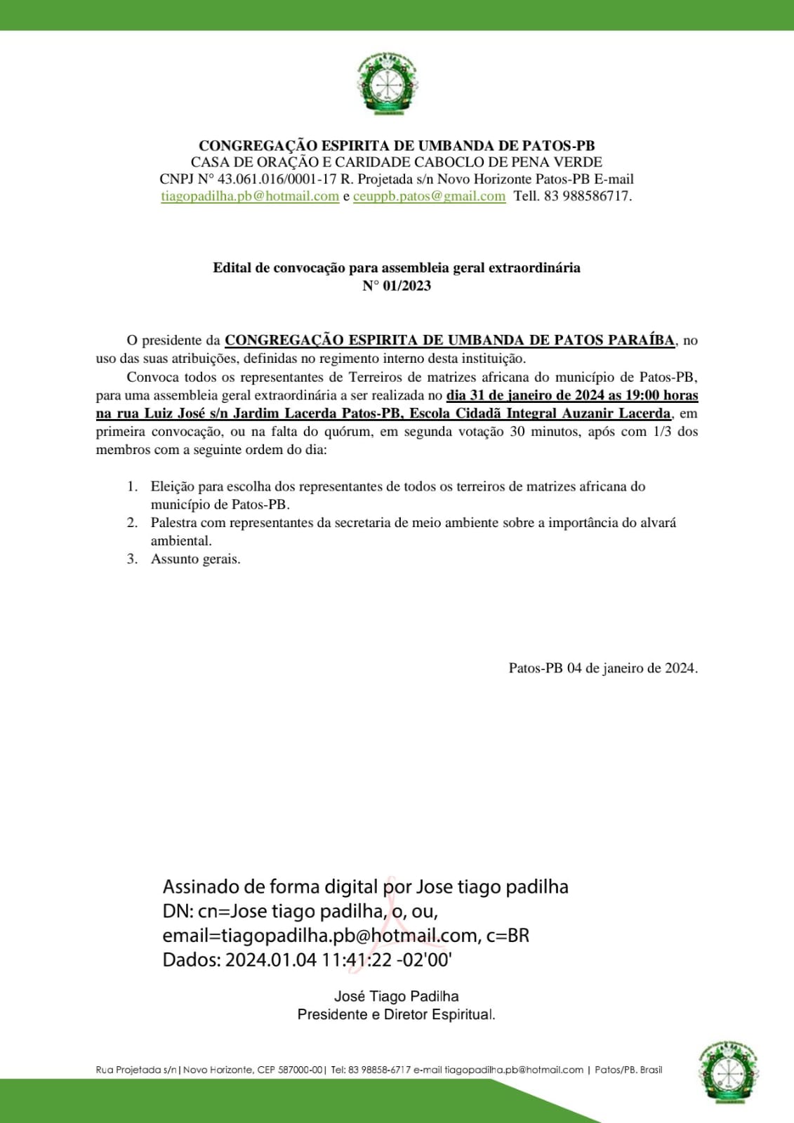 O presidente da Congregação Espírita de Umbanda de Patos, Tiago Padilha, vem a público convidar todos os Babálorixá, Yálorixá, Juremeiros do município de Patos para inscrever as referidas casas, barracões, tendas, templos e Ylés para que no próximo dia 31 de janeiro, às 19h, na quadra poliesportiva da Escola Cidadã Integral Auzanir Lacerda, localizada na Rua Luiz José s/n Bairro Jardim Lacerda, para uma assembleia geral onde teremos oportunidade de escolher os representantes dos povos de matrizes africanas do município. O evento tem por objetivo escolher membros para que possam lutar por seus direitos enquanto participantes de religiões de matrizes.