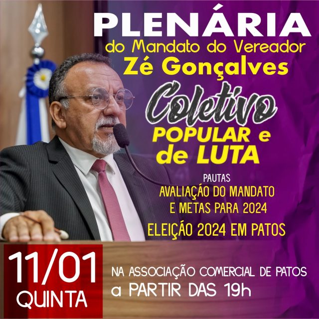 O vereador sindicalista Zé Gonçalves, realizará mais uma Plenária Municipal, através do Coletivo Popular e de Luta, onde será feito uma avaliação do mandato e metas para 2024, além de discutir as eleições do corrente ano.