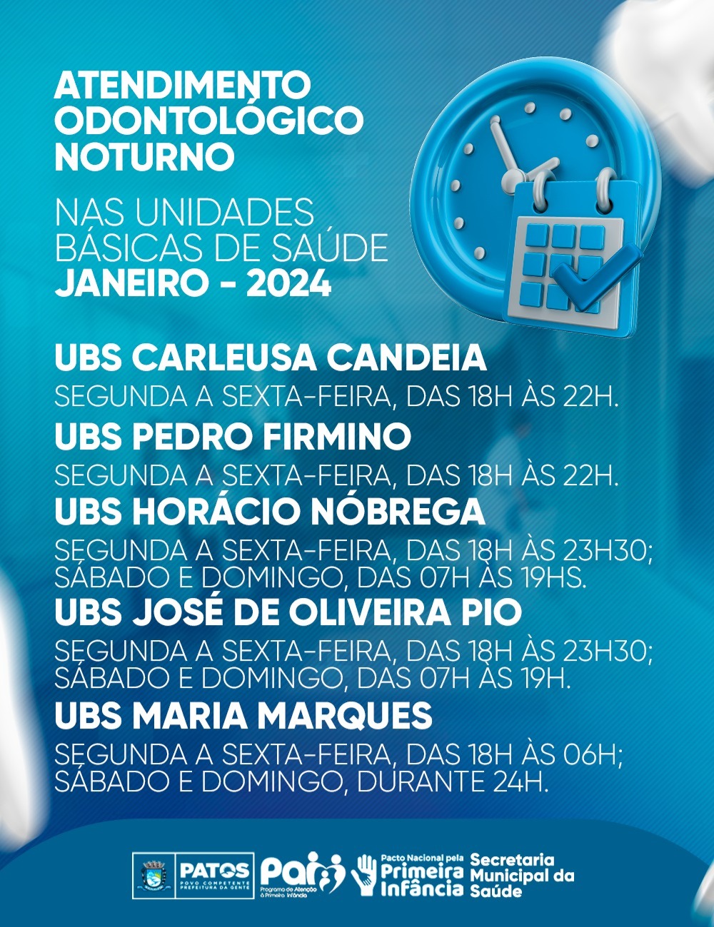 Em um esforço contínuo para garantir o acesso à saúde bucal da população, a Secretaria Municipal de Saúde de Patos anunciou um cronograma especial de atendimento odontológico para o mês de janeiro. Esta iniciativa visa assegurar que, mesmo durante o período em que alguns profissionais estão de férias, a assistência odontológica não seja interrompida.