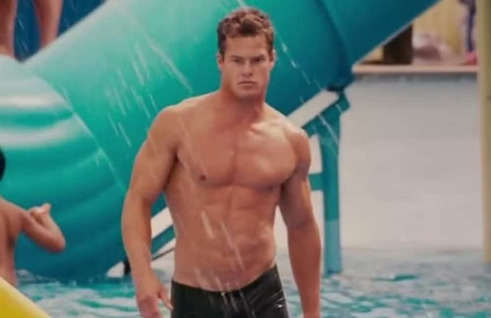 No blockbuster “Gente Grande”, Musser aparece em uma cena como um galã, cheio de músculos, mas que tem voz fina.