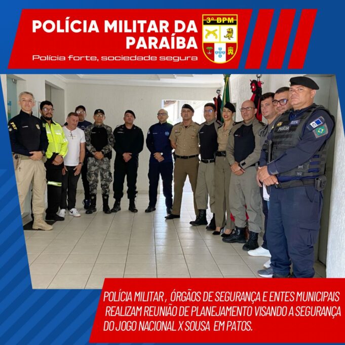 Em nome do Comando da Unidade, o subcomandante do 3°BPM, Cap Dillery, realizou reunião na Sede do Batalhão para planejar, definir e alinhar estratégias de segurança para o jogo de futebol entre o Nacional Atlético Clube e o Sousa Esporte Clube, marcado para o próximo domingo, dia 21, no Estádio Municipal José Cavalcanti em Patos.