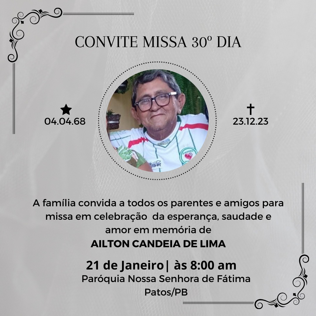 Os familiares do senhor Ailton Candeia de Lima convidam parentes e amigos para a Missa de 30º Dia em sufrágio de sua alma.