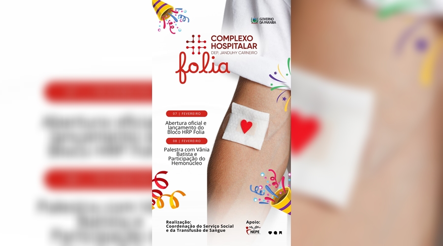 O Complexo Hospitalar Regional Deputado Janduhy Carneiro (CHRDJC), unidade integrante da rede de saúde do Governo da Paraíba, em Patos, realizará ação solidária nesta quarta-feira (07). O objetivo é mobilizar acompanhantes e familiares para doar sangue e assim reforçar o estoque estratégico do Hemonúcleo de Patos durante o período carnavalesco quando, normalmente, as doações são reduzidas. A agenda também será marcada pelo lançamento do bloco ‘HRP Folia Solidário’.