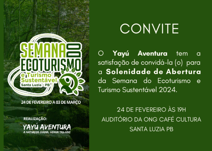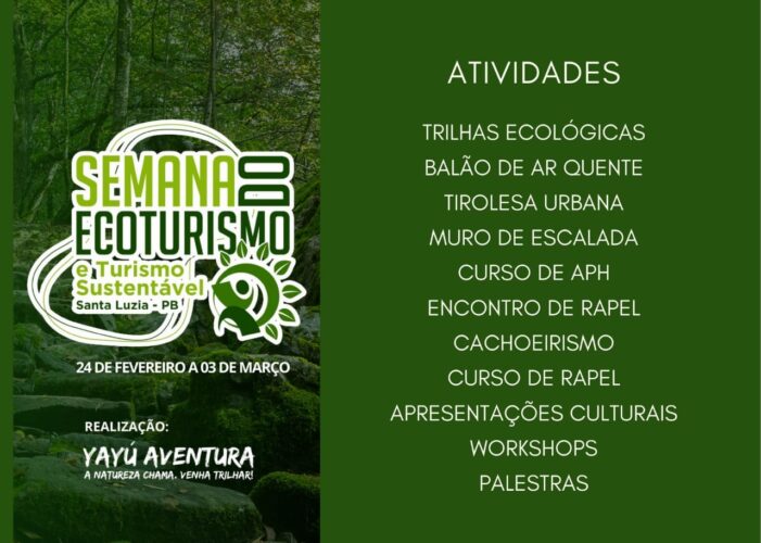 A Semana do Ecoturismo e Turismo Sustentável de Santa Luzia, na Região Metropolitana de Patos, está de volta em 2024, promovendo uma experiência única que integra ecoturismo, educação ambiental, cultura e desenvolvimento sustentável. Com o sucesso marcante da edição de 2023, esta nova versão se propõe a ir além, enriquecendo ainda mais a conexão entre nossa comunidade e o meio ambiente.