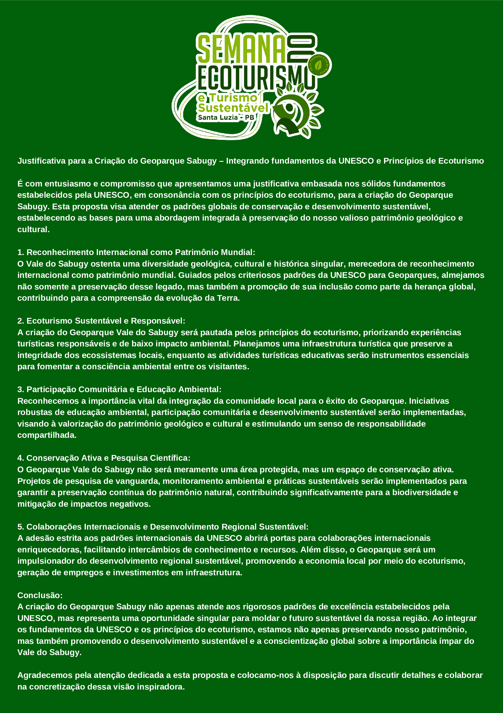 A Semana do Ecoturismo é um projeto cultural que destaca o compromisso com a valorização da herança cultural e histórica, promovendo o turismo responsável e sustentável. O evento busca não apenas preservar nossa rica herança, mas também impulsionar o desenvolvimento econômico, fortalecendo a economia local de maneira autêntica.