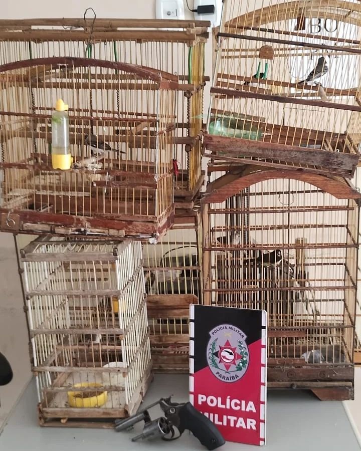 No interior da casa, foram apreendidos oito pássaros de diferentes espécies, oito gaiolas e um revólver calibre 38.