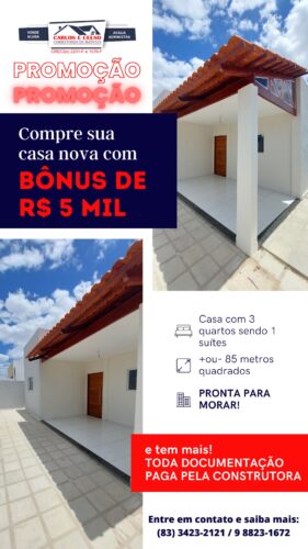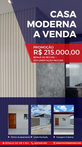 Promoção: bônus de R$ 5.000,00 mais documentação inclusa! Casa com três quartos à venda por R$ 215.000,00 no Loteamento Luar de Carmem Leda, em Patos.