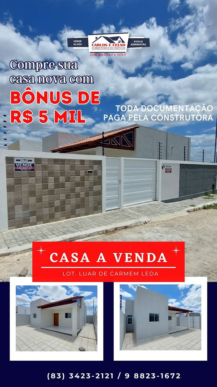 Promoção: bônus de R$ 5.000,00 mais documentação inclusa! Casa com três quartos à venda por R$ 215.000,00 no Loteamento Luar de Carmem Leda, em Patos.