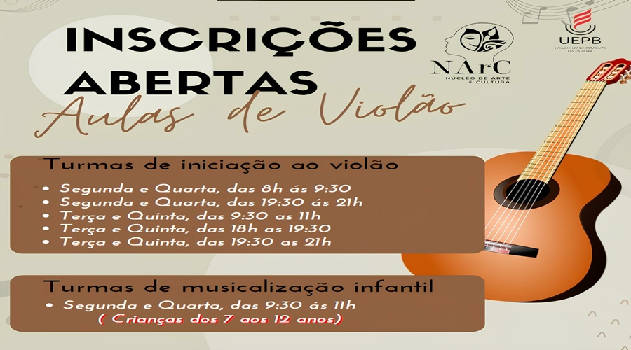 O Núcleo de Arte e Cultura (NArC), do Centro de Ciências Exatas e Sociais Aplicadas (CCEA), da Universidade Estadual da Paraíba (UEPB), Câmpus VII de Patos, oferece mais uma oportunidade para quem deseja aprender a tocar um instrumento musical. Estão abertas as inscrições para os cursos de “Iniciação ao Violão” e “Musicalização Infantil”, para o semestre 2024.1. Os cursos são voltados à comunidade acadêmica e à sociedade em geral.